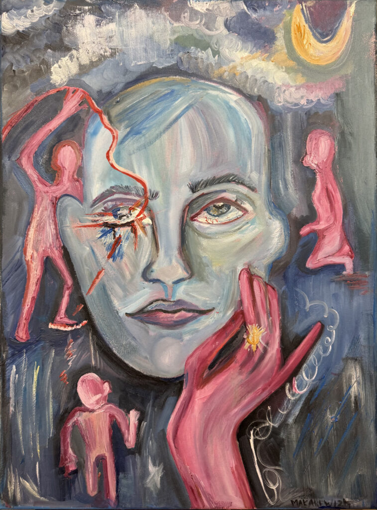 “My name is Evgeniya Makarevich, I’m 20 years old, and I’m an artist from Minsk. My creative path began with graphic design—I recently received my bachelor’s degree in this field, and it gave me a strong foundation for working with form and color. But I truly blossom in painting, which I only recently became interested in. In my work, I combine design precision with emotional expression: I explore inner worlds, human fragility, and surreal narratives. For me, the canvas is a space where I can transcend digital standards, experimenting with textures and meanings, transforming personal reflection into a visual language.”